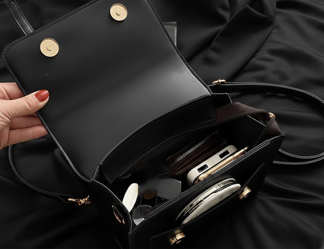 Material: PU Leather outer with polyester interior. Gold metal hardware.