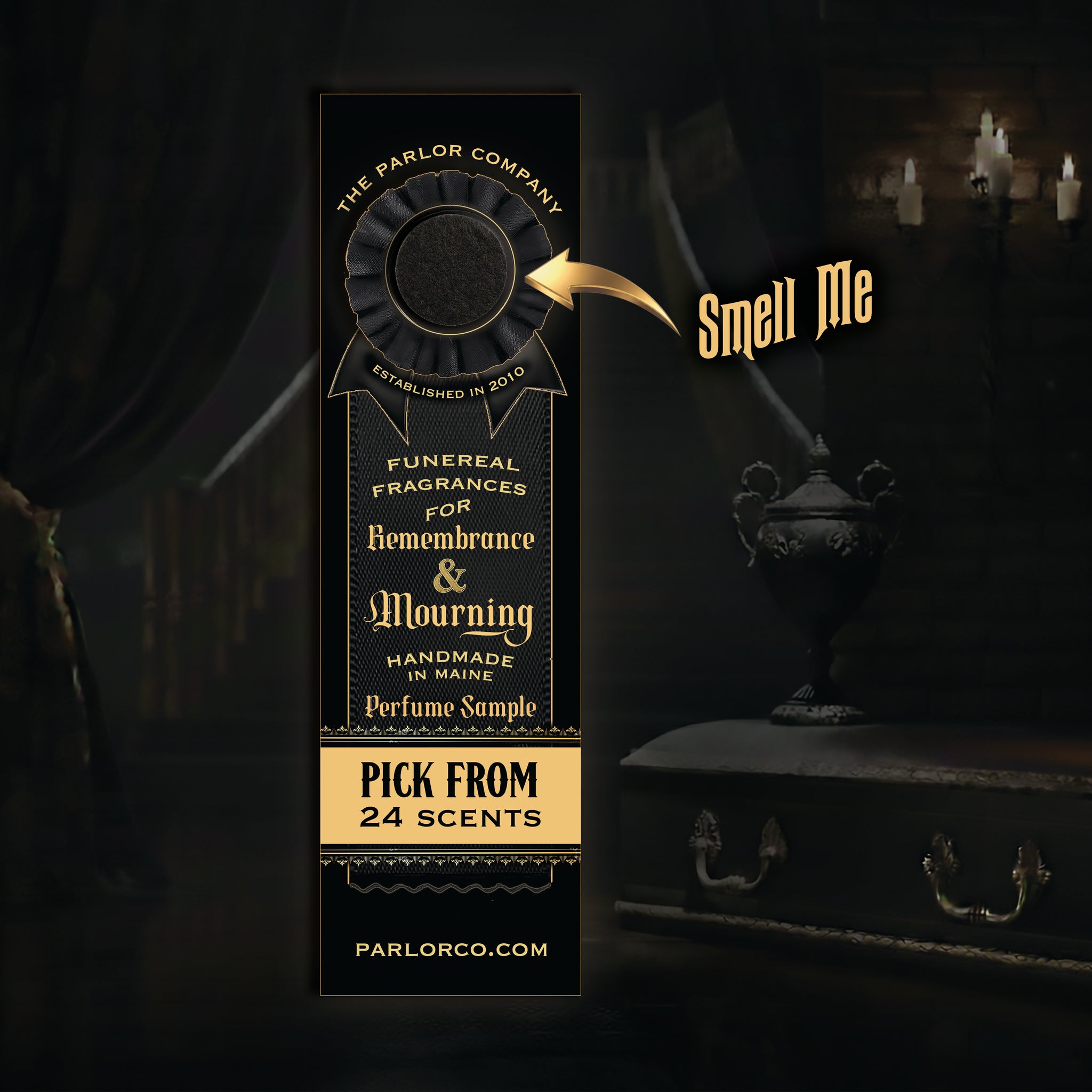 The Parlor Company's scent "mouilette" cards beckon you into a world of eerie enchantment, where 24 mysterious fragrances linger in the shadows, waiting to be discovered. Each card bears a felt pad, haunted by a few chilling drops of concentrated liquid fragrance—dare to inhale, and let each scent whisper secrets from another realm. When your senses have wandered the spectral collection, slip these cards into a drawer or handbag, where their ghostly aroma will linger, haunting your belongings long after the first whiff.