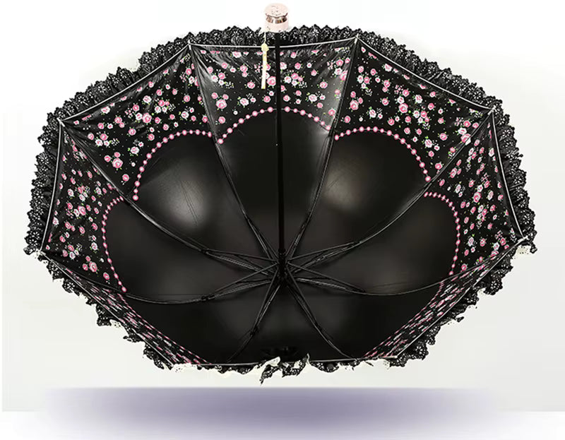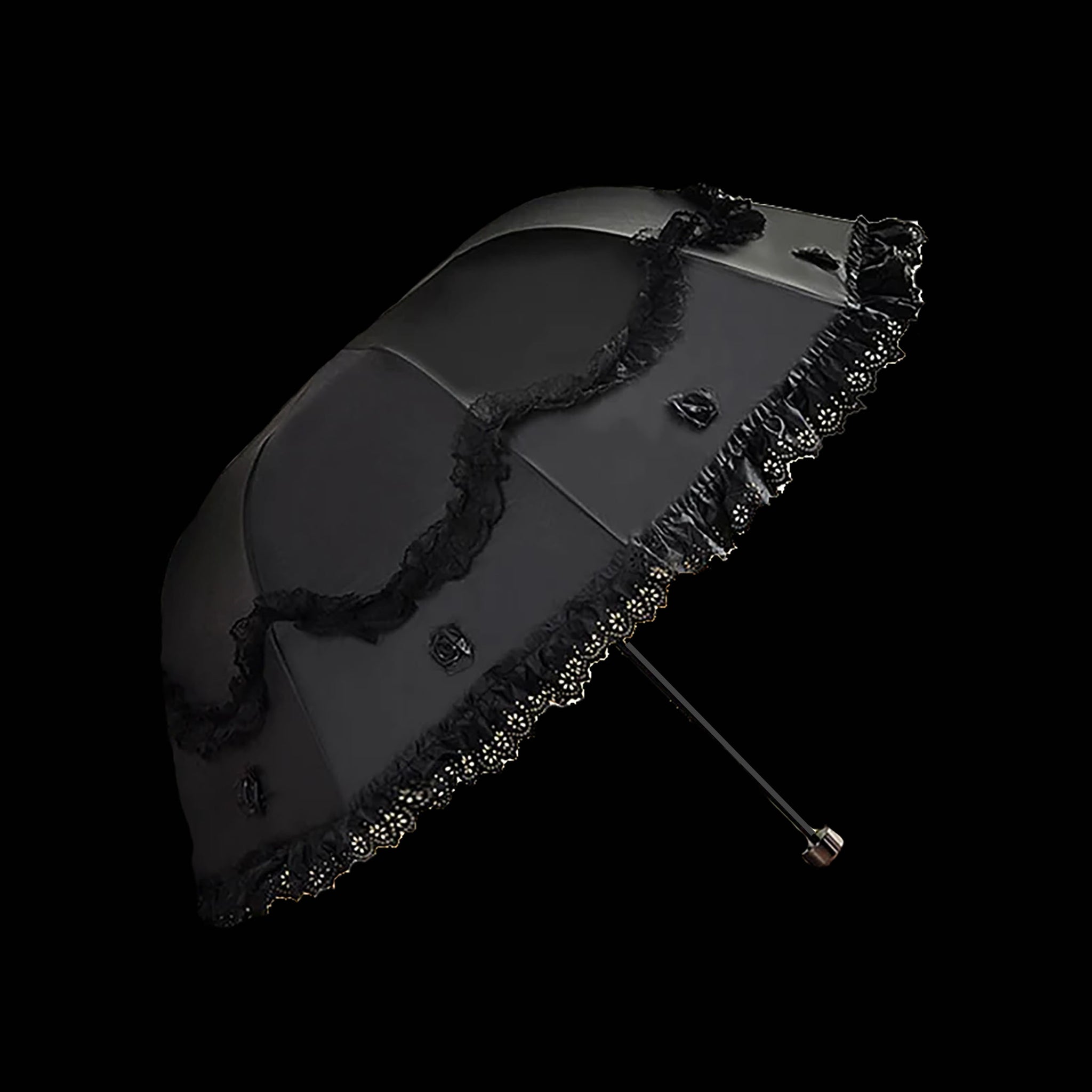 This pretty lace umbrella is the perfect accessory with all your black mourning outfits. Use as an umbrella during the rain or as a parasol for sun protection. Comes tucked inside a lace satchel for carrying and the underside features a floral print.